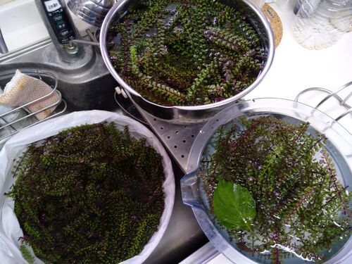 去年は、猛暑で赤しそが大きく育たず、早々に枯れ落ちて、まったく収穫できなかった。 今年は、かろうじて、生き残った種から生えた二葉を、移し替えたり、肥料をやったりなど手をかけたおかげで、大きな葉が収穫できるようになった。 柴漬け(赤しそ漬け)…